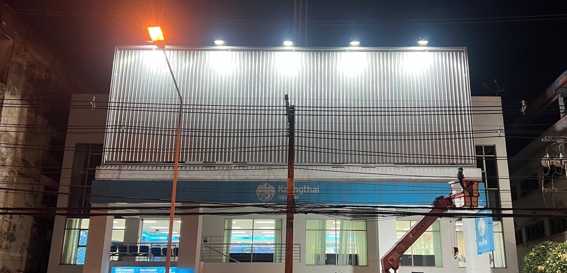ลักษณะงาน : ป้ายโครงสร้างอลูมิเนียม Billboard มาพร้อมกับงานพิมพ์ไวนิลและระบบไฟ โคมสปอร์ตไลท์ LED ขนาดป้าย สูง 6.50 เมตร x กว้าง 18.40 เมตร