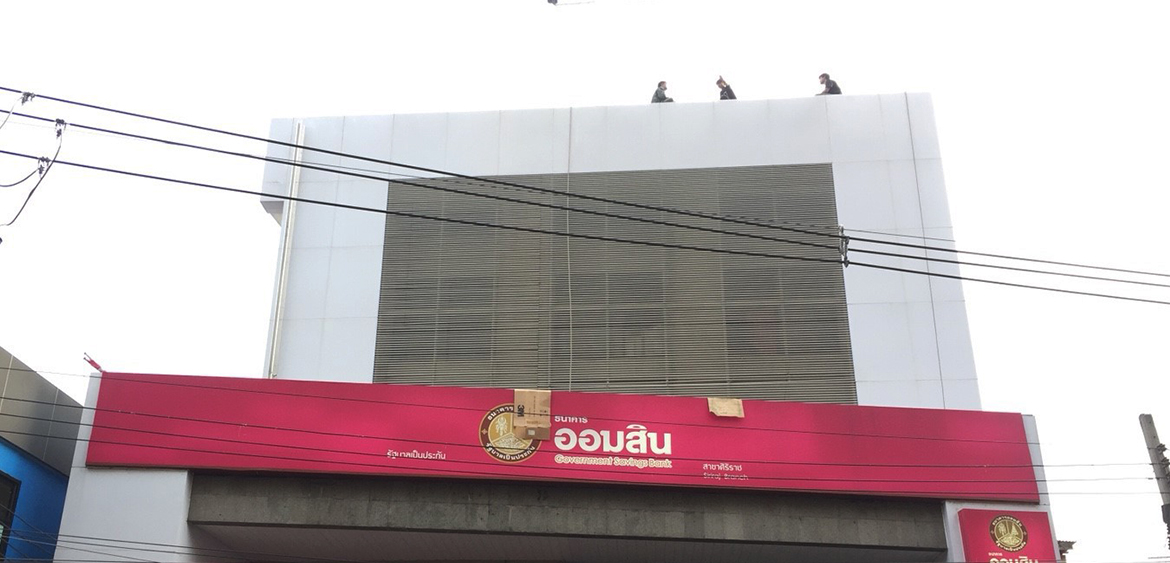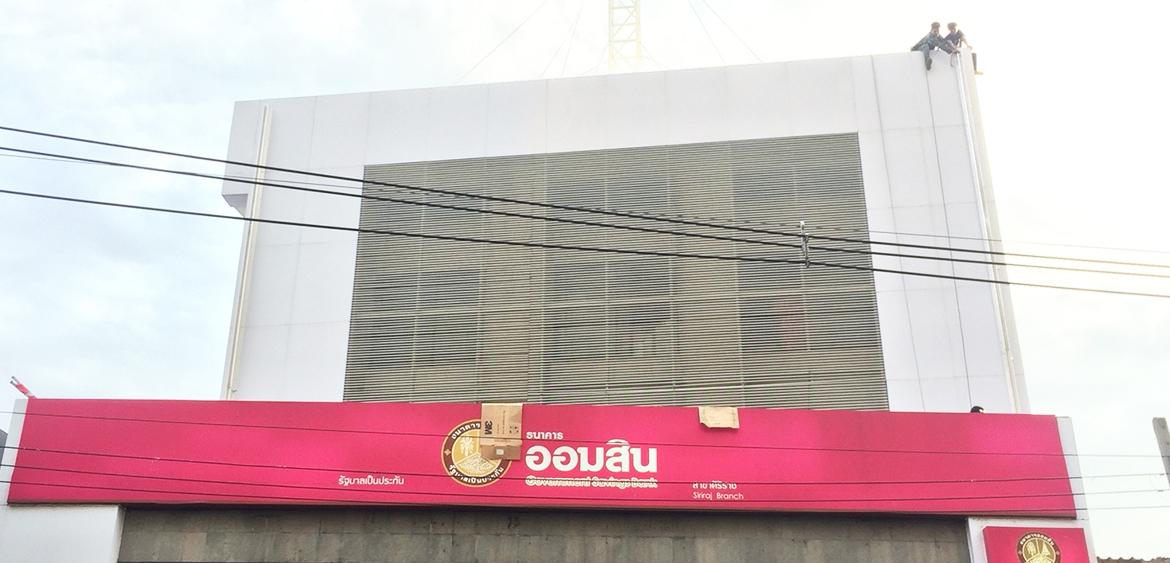 ชื่อ : ธนาคารออมสิน สาขาศิริราช วัน/เดือน/ปี ที่ติดตั้ง : 18 ตุลาคม 2559 ประเภท : โครงสร้างป้าย Branch Billboard Easy Lock พร้อมงานพิมพ์ ความท้าทายของโปรเจคนี้ : โครงสร้างปลอดสนิมเพราะเป็นอลูมิเนียม น้ำหนักเบาทนทาน ผลงานสวยงามได้มาตรฐาน