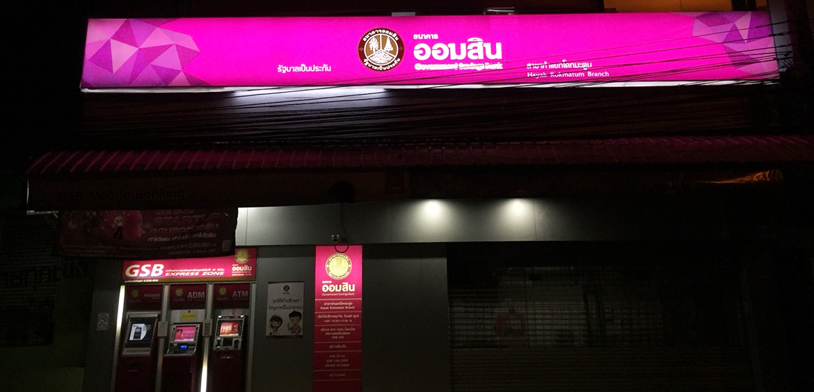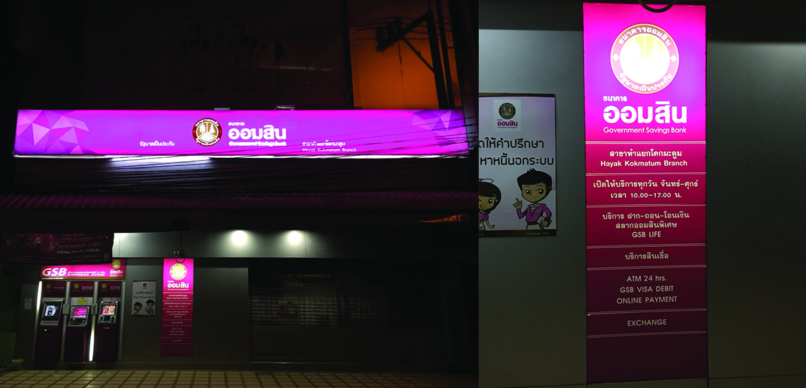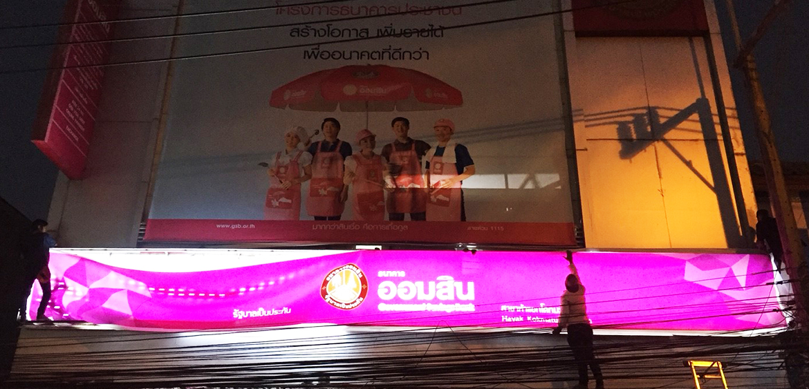 ชื่อ : ธนาคารออมสิน สาขาห้าแยกโคกมะตูม วัน/เดือน/ปี ที่ติดตั้ง : 10 มกราคม 2561 ประเภท : เปลี่ยนไวนิลโปร่งแสง, สติ๊กเกอร์ และระบบไฟเป็น LED ความท้าทายของโปรเจคนี้ : โลโก้สวยหรู ไม่ว่าจะดูเวลาไหนด้วยรูปแบบใหม่ (Look & Feel) และระบบไฟภายในป้าย