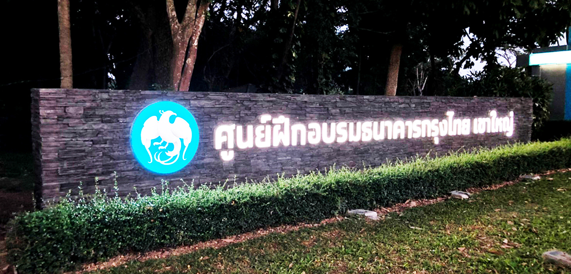 ชื่อผลงาน : งานป้ายศูนย์ฝึกอบรม ธนาคารกรุงไทย (เขาใหญ่) ชื่อลูกค้า : ธนาคารกรุงไทย ลักษณะงาน : งานผนังหินสไตล์ โมเดิร์นและอักษรโลหะไฟออกด้านหน้า ** รูปแบบผนังหินที่ทันสมัย ตรงใจลูกค้า ชุดอักษรโลหะ ไฟLEDสวยงาม โดดเด่น ท่ามกลางธรรมชาติ เขาใหญ่ **
